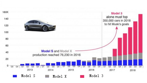 圖:特斯拉三款車型:Model S, Model X和Model 3的歷史銷量及預期銷量
