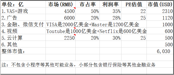 我們用兩種方法來估算騰訊的市場空間。假設騰訊可以在線上互聯網GDP中拿到45%,也就5800億人民幣,在“互聯網+”GDP中拿到15%(因為只有支付金融自己做,其他都是20%左右投資其他公司),即2700億人民幣,兩者加在一起并給30%凈利潤率和估值20倍,差不多有6000-7000億美元市值。還有一種按照各個業務拆分毛估值的辦法,請參看下表。