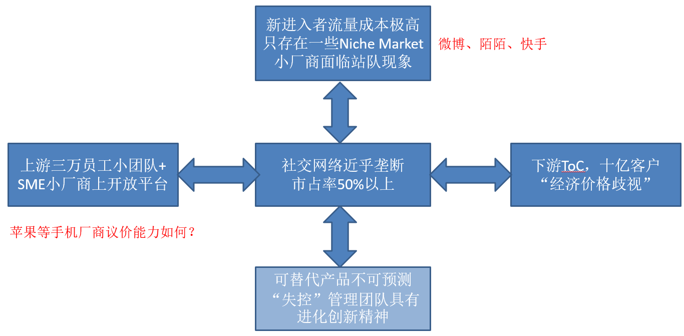 通過波特五力模型,我們可以更系統化地來分析騰訊公司的護城河和競爭格局。在現有競爭對手中,騰訊通過社交網絡近乎壟斷流量,市占率在50%以上。在對下游的格局中,騰訊面對的是十億客戶,有很強的“to C”“經濟學價格歧視”能力。在對上游供應商的格局中,公司內部三四萬員工的小團隊,各種SME小廠商上開放平臺,再加上騰訊外部投資的眾多公司。在當今的互聯網時代,新進入者的流量成本極高,只存在一些Niche Market(微博、陌陌、快手),而且小廠商都面臨站隊現象。最后騰訊最大的威脅來自于可替代產品的不可預測性,但是騰訊的“失控”管理團隊具有足夠的自我進化創新精神,這一點我將在管理團隊一節來詳細闡述。