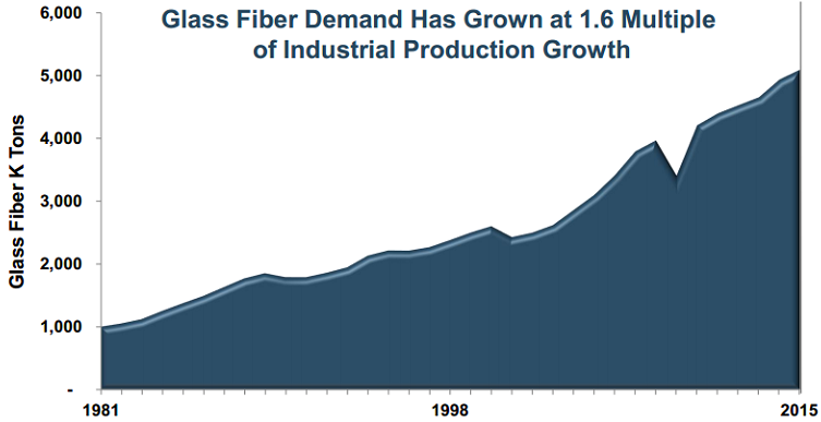 玻纖行業也有一定的周期性。1990年的地產危機、2000年的東南亞金融危機、2009年的次債危機擴散對玻纖需求都有明顯的影響,除此之外,玻纖需求一直保持平穩的增長,其中2000年以來中國的工業化給玻纖行業注入了強勁的動力,牽引行業維持了10年的高速增長,隨著中國進入后工業化時代,玻纖需求的增長進入相對穩定期。