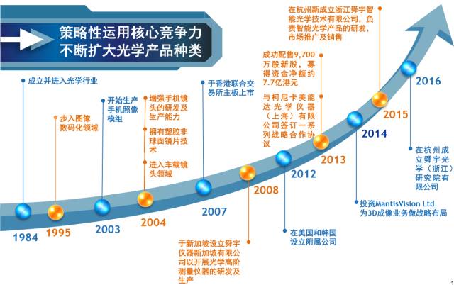 舜宇光學科技前身為成立于1984年的余姚市第二光學儀器廠,主營顯微鏡、光譜儀等光學儀器,1995年更名為浙江舜宇,2003年進入手機鏡頭模組行業,2004年進入車載鏡頭行業,于2007年6月在香港主板上市,現已成長為中國領先的綜合光學產品制造商和光學影像系統解決方案提供商。