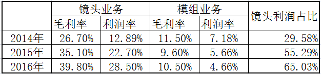 舜宇2016年收入146億元人民幣中,光學零件(手機鏡頭、車載鏡頭等)為29.6億,光電產品(手機鏡頭模組業務)為114億,光學儀器收入2.5億,看似模組業務占了大頭,實則在12.7億的凈利潤中,鏡頭業務占比已達到2/3,模組業務占比僅為1/3