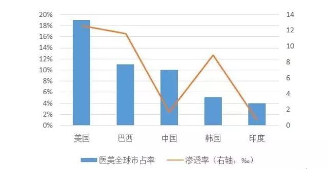 根據國際美容整形外科學會ISAPS發布的2015年全球醫美就診人數來看,美國目前是全球第一大醫美國家,占全球的比例為19%。無論從整形項目數、整形外科醫師數量上來說美國均是全球第一,并且遙遙領先。由于美國跟我國的經濟體量、人口規模等均處于同一量級,因此具有相當的可比性。