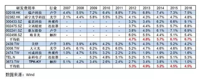 五年前,美國高校的一位經濟學教授在《福布斯》雜志發表文章,稱中國人具有“儒家的順從性”,傾向于跟隨而非引領,骨子里不具備創新的基因,然而,隨著中國經濟實力的增強和創新意識的崛起,無論是互聯網行業、服務業還是制造業,中國已經出現一批優秀的領軍企業。對比分析中國與海外消費電子零部件龍頭的研發費用率,近5年來中國企業的研發投入占比逐年快速增加,而海外企業呈略微下降趨勢。