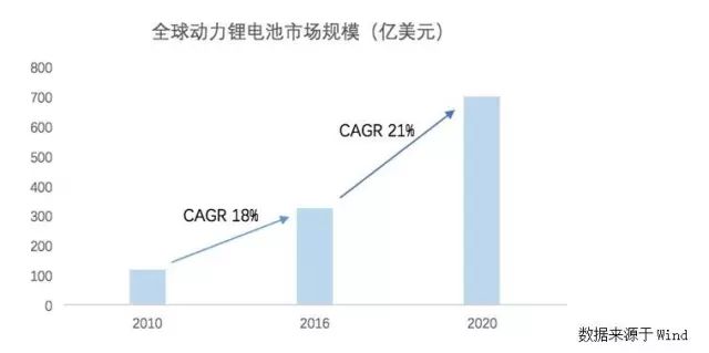 與傳統汽車由內燃機驅動不同,新能源汽車主要依靠電機控制,而驅動電機運行的核心部件便在于動力電池,直接決定了電動車的續航里程及充電性能,目前其價格就占到整車總成本的30%-40%。近幾年,全球新能源汽車的發展極大促進了動力鋰電池產業的繁榮,據統計,2010-2016年間全球動力鋰電池產業規模從122億美元增長至328億美元,年均復合增速為18%。未來隨著新能源汽車滲透率的不斷提升以及鋰電池技術的快速迭代,全球動力鋰電池產業將會呈現飛躍式發展,預計到2020年規模可達700億美元以上。