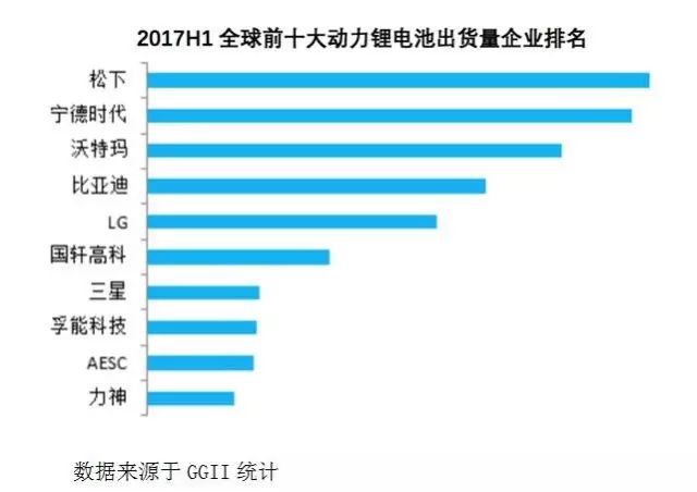 在市場格局方面,全球動力鋰電池產業主要集中在中、日、韓三國,市場份額合計占比高達97%。其中,自2015年開始,中國動力鋰電池產業在政府政策的帶動下規模迅猛增長,一躍超過日本、韓國,至2016年市占率達40%,居全球首位。再細分到企業,根據GGII統計,2017年上半年全球動力鋰電池出貨量為28GWh,同比增長67%。其中,前十大企業合計出貨量為21GWh,市占率達76%,除日本的松下、AESC,韓國的LG化學、三星外,其余均為中國企業,包括CATL、沃特瑪、比亞迪、國軒高科、孚能科技、力神等。照此態勢,未來中國有望主宰全球動力鋰電池市場,預計到2020年市場份額將超過60%。