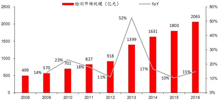 改革開放40年以來,我國國民經濟飛速發展,現已進入高質量發展階段,追求的是與生態環境相協調的可持續發展,而經濟的發展伴隨著的是國民收入的提升,大家也更加關注生活的品質,習總書記適時提出美麗中國和美好生活的生態文明思想,深刻地抓住了當下中國社會經濟的主要矛盾。而何為美麗,何為美好,如果要得到一個量化答案,就得求助于檢測機構。實際上,在建設生態文明的大背景下,我國的檢測市場近些年來取得了長足的發展,2008-2016年,中國檢測市場規模從499億元增長至2065億元,復合增速達到19.4%。
