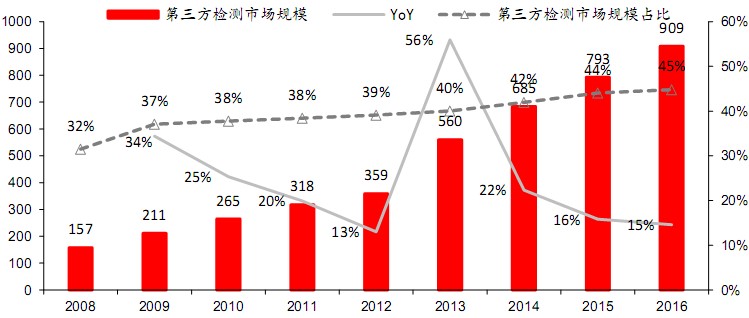 我國早期的檢測機構以政府機構為主,政府在國內雖然具有天然的公信力,但是以犧牲效率為代價的,隨著我國市場經濟的快速發展,原來的檢測體制越來越成為一種掣肘。2013年大部制改革后,國家食品藥品監督管理總局、質檢局等重新整合,國有檢測機構在形式上撤去官方屬性,正式參與到與民營機構、外資機構的市場競爭中來。2014年國務院發布《關于加快科技服務業發展的若干意見》 ,加快發展第三方檢驗檢測認證服務,鼓勵不同所有制檢驗檢測認證機構平等參與市場競爭,支持具備條件的檢驗檢測認證機構與行政部門脫鉤,轉企改制,加快推進跨部門、跨行業、跨層級整合與并購重組。在政策的支持下,我國第三方檢測市場逐漸發展起來。2008-2016年,中國第三方檢測市場規模從157億元增長至909億元,復合增速達到24.5%,高于檢測市場整體增速。