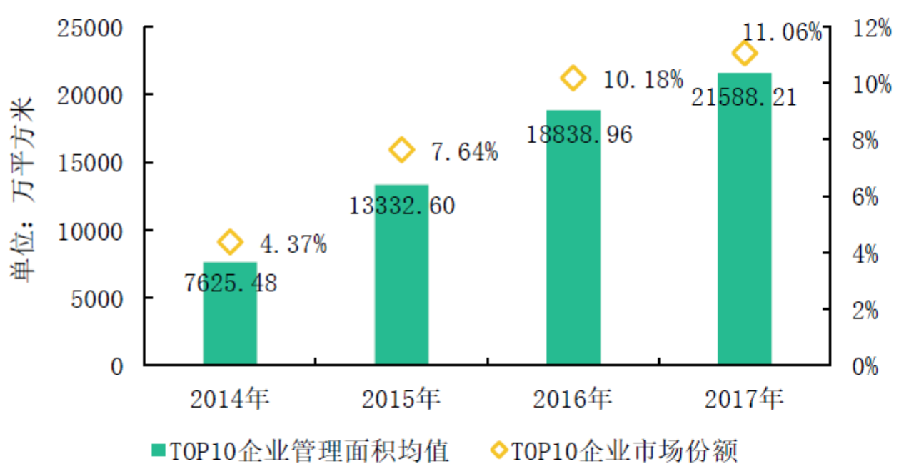 目前行業內大多數公司的主要收入來源是物業管理費。物業管理費=在管面積*單位物業費,由于物業費受到物價局管制,而且提價需要小區過半業主同意,往往提價難度高,因此基礎物業收入的增長主要來自管理面積的擴張,擴張方式為背靠開發商每年的新增銷售以及市場化獲取。2017年全行業物業管理面積約200億平米,近3年全國商品房銷售面積分別為12.8、15.7、16.9億平米,預計未來數年年均新增面積在10億平米以上,2017年物業行業龍頭市占率不到2%,top10企業市占率僅11 %,而top10地產開發商的市占率高達25%,隨著地產銷售集中度的提升,背靠強勢開發商的物業公司也將跟隨上游快速增長。