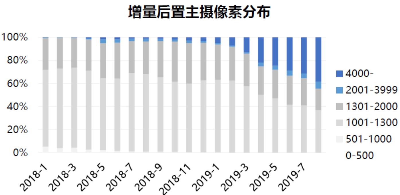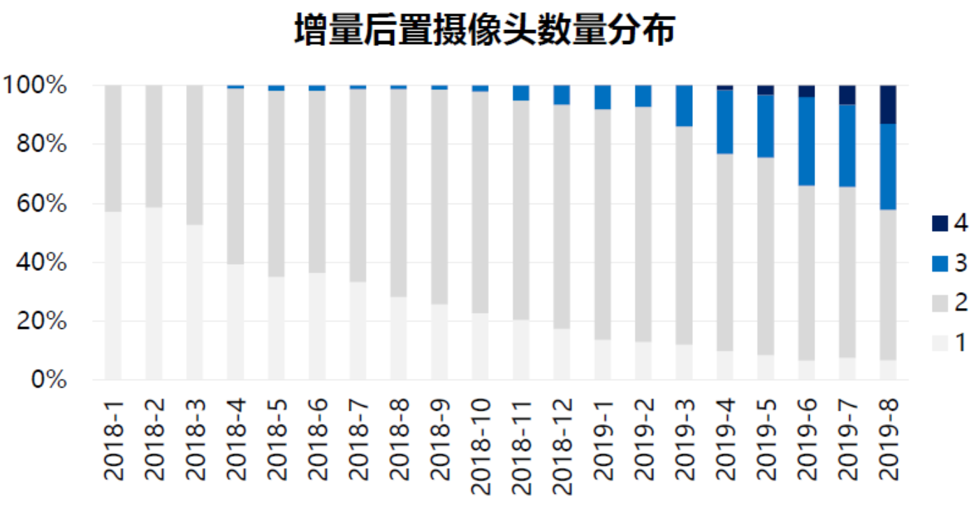 一、攝像頭數(shù)量增加。華為于2016年4月發(fā)布旗艦手機P9,首次開啟雙攝浪潮,其配備兩顆1200萬像素鏡頭,其中彩色鏡頭獲取物體的色彩,黑白鏡頭獲取物體的光度和細節(jié),兩張圖片融合后色彩和細節(jié)都得到最大還原。隨后蘋果于2016年9月發(fā)布首款雙攝旗艦 iPhone 7 Plus。在華為旗艦應用雙攝的2年后,業(yè)界出現(xiàn)攝像頭需求量見頂?shù)膿鷳n,但三攝和四攝隨之到來,華為于2018年發(fā)布的P系列和Mate系列中均采用了三攝像頭設計,三顆鏡頭分別起到彩色廣角、黑白廣角、彩色長焦的功能,成像質量大幅提高,光學變焦功能也得到增強。華為三攝的成功帶動了其他品牌拍攝的創(chuàng)新升級,各大旗艦機型在2019年均采用了后置三攝方案。