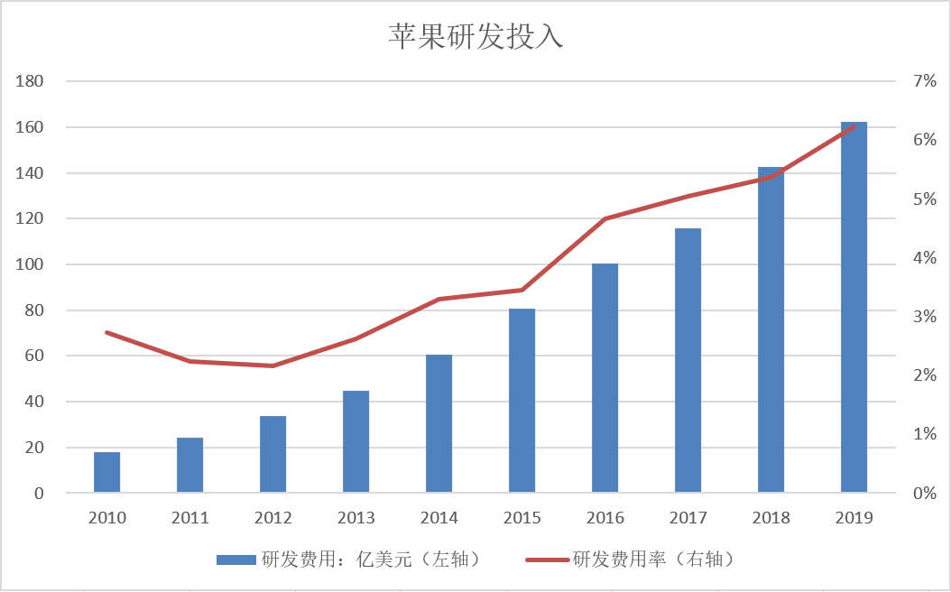 市場對蘋果的質疑,看到的只是硬件方面的對比,而蘋果相比于其他廠商,最大的優勢在于基于硬件、軟件、服務的整合創新優化。在全球化的時代里,合作分工的模式讓行業參與者各司其職,有些公司專注研發操作系統,有些專注做手機芯片,有些則是采購零部件生產手機,但只有蘋果把整個生態做到了極致,給用戶帶來絕佳的體驗。以拍攝為例,幾乎每一代的iPhone像素都低于其他品牌的旗艦機型,但仍然具有很好的拍照效果,這其實就是系統、軟件與硬件做到了集成優化。從蘋果公司的研發投入數據來看,近幾年持續攀升,研發費用率從2012財年的2.2%提升至2019財年的6.2%,年度研發費用也超過了千億人民幣。