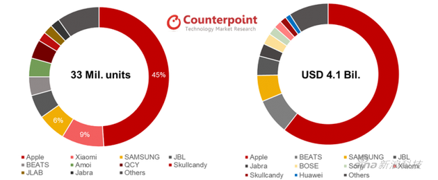 蘋果第一代無線藍牙耳機Airpods于2016年發布,當時剛上市一個月就拿下美國無線耳機線上市場26%的份額,銷量達到了美國市場無線耳機銷量月均值的10倍,實際上Airpods已經火了3年,只是最近新一代耳機發布后持續的供不應求才引起市場的廣泛關注。根據研究機構Counterpoint Research的一份新報告,無線耳機市場在上一個季度出貨量大幅增長,全球TWS無線耳機市場規模達到3300萬部(41億美元),環比增長22%,蘋果品牌在銷量上占比45%,由于售價遠高于其他品牌,在銷售額上占比超過60%。市場預計今年Airpods銷量6000萬部,明年將超過1億部,而2017年銷量不過1500萬部。這款產品給蘋果帶來的收入將超過iPod曾給蘋果帶來的收入峰值,已成為后喬布斯時代的現象級產品。