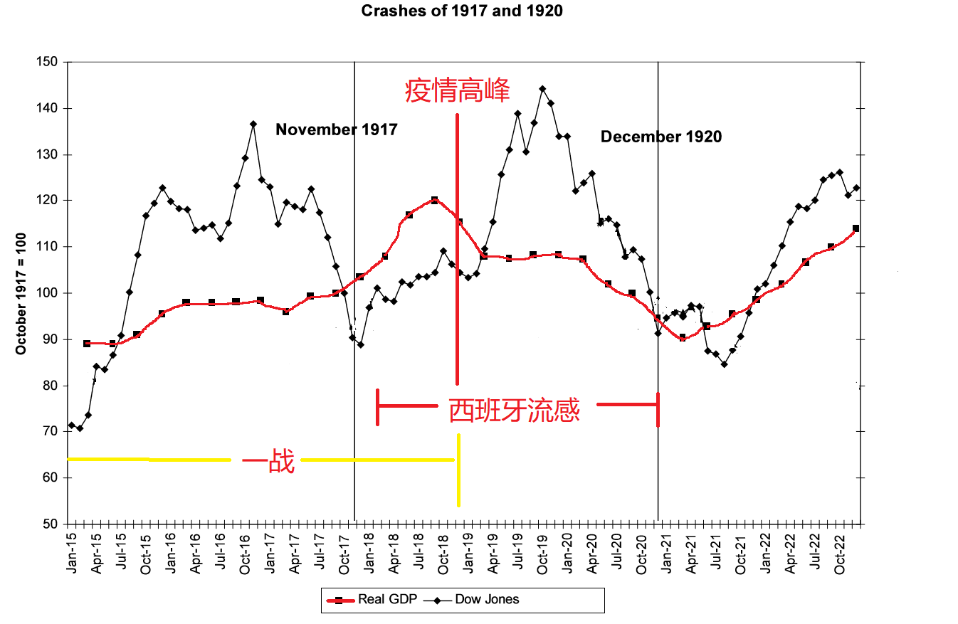 1918-1920年爆發的西班牙流感對全球經濟和股市帶來了明顯的影響,上圖為美國1915年1月至1922年12月期間的月度GDP數據和道瓊斯指數走勢。從經濟角度看,本次流感爆發期和第一次世界大戰有部分時間上的重合,戰爭初期美國保持中立,為滿足交戰雙方對軍用物資的需求,迅速擴大了軍工生產和重工生產;1918年一戰結束,由于主戰場在歐洲,生產設施損毀,而美國依靠戰爭中積累下來的雄厚資金,快速擴大生產規模,大量輸出商品,因此美國在戰爭末期從資本輸入國變為資本輸出國,從債務國變成債權國,當年實現高速的經濟增長。但1918年秋季疫情高峰到來,死亡率大幅提高,尤其是年輕勞動力的死亡率最高,直接導致經濟向下拐點的到來,一直持續到1922年初疫情徹底結束后才重回增長。年度數據上看,1918年美國GDP增速高達9%,1919年增速下滑至0.8%,1920年轉為負增長,GDP下滑-0.9%,1921年繼續下滑-2.3%。股市表現上看, 1917年4月美國對德宣戰,隨后股市大跌;1918年戰爭趨于結束,美國經濟高增長,帶動股市開始大幅上漲,盡管當時疫情大爆發,可能市場并未意識到或者低估了疫情將帶來的經濟衰退,仍沉浸在戰后重建的高增長預期中,直到1919年10月股市才拐頭向下,當時經濟數據已經出現環比下滑,股市一直跌到1921年8月才見大底,累計最大跌幅43%。