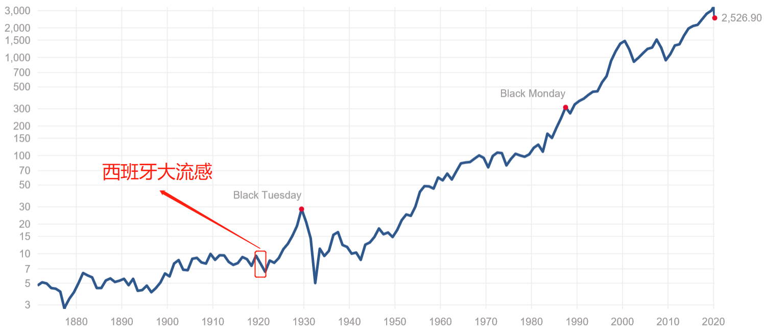 疫情結束后的十年里,咆哮的不僅是經濟,還有股市。美股自1921年見底后一路扶搖而上,1928到1929年里股市幾乎沒有回調,投機行為盛行,資金不斷涌入,似乎牛市永無休止,到1929年標普500指數最大漲幅接近4倍,直到10月29日這個星期二,市場突然崩盤,拉開了百年一遇大蕭條的序幕。上圖為美國標普500指數過去150年的走勢,圖中可以看到,這場20世紀的大瘟疫引起的波動只是歷史長河中的小小浪花一朵,并沒有改變長期的上漲趨勢,災難總會過去,蓬勃的經濟、昂揚的股市終會到來。