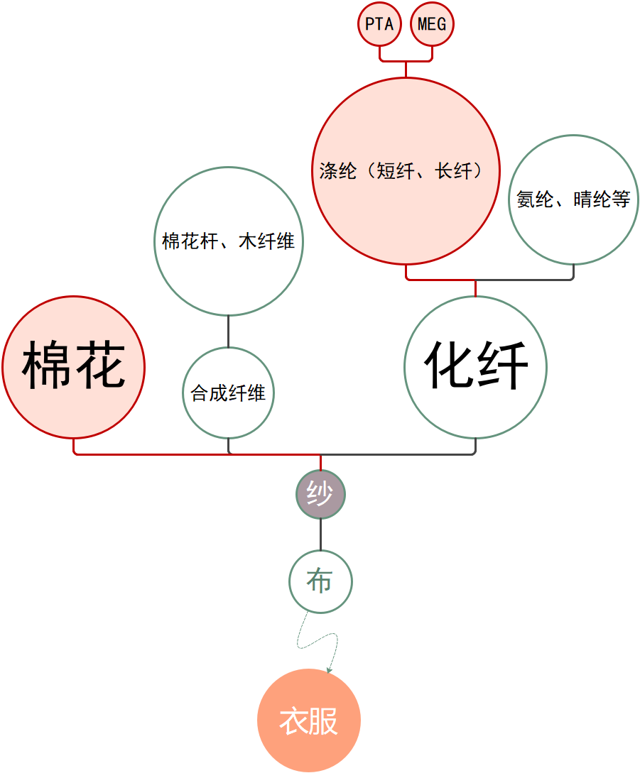 衣服類的期貨品種有棉花、PTA、MEG、短纖。短纖屬于滌綸的一種,滌綸是用量最大的化學(xué)纖維。而滌綸是由PTA和MEG兩種化學(xué)物質(zhì)化合而成。PTA是石油的下游產(chǎn)品,石油中輕質(zhì)成分用來生產(chǎn)PX,PX加工成PTA;MEG既可以通過石油生產(chǎn)也可以通過煤炭生產(chǎn)。